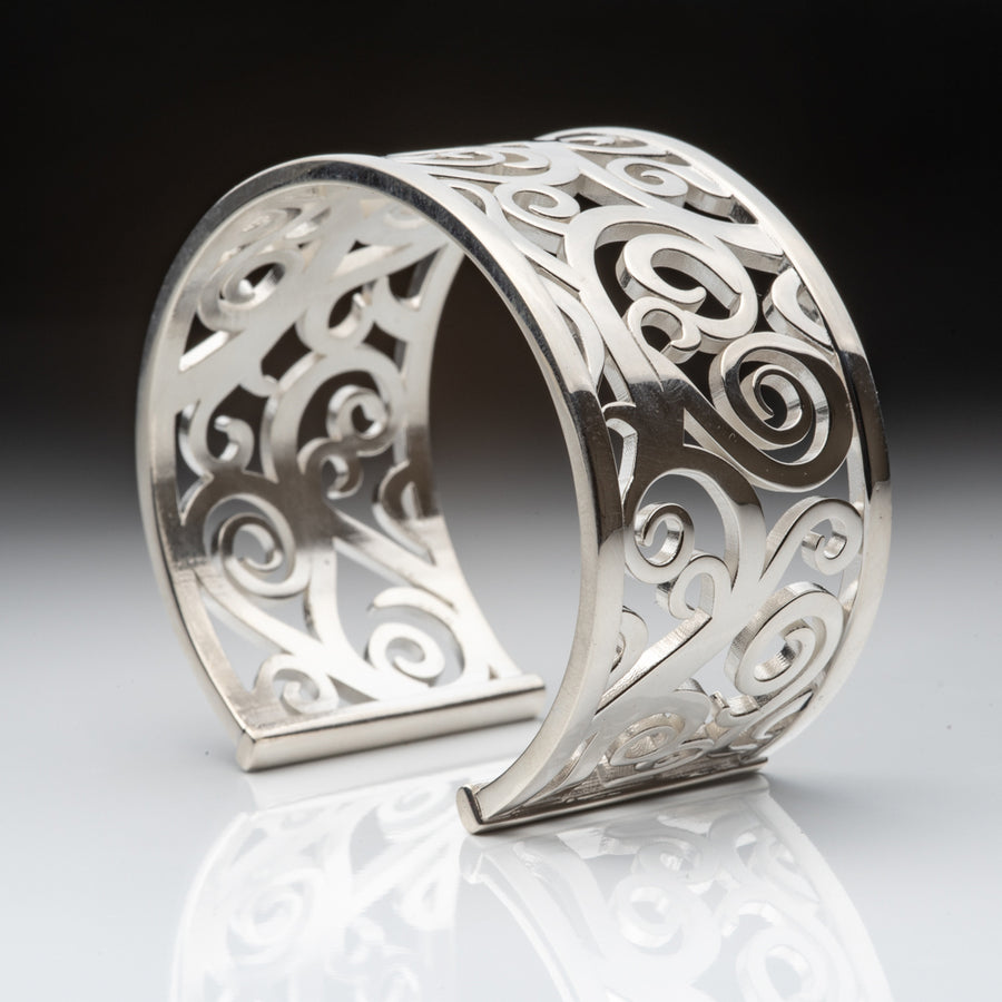 You admire the constantly changing rhythms of a bustling city, loosing yourself in the winding, weaving, and wandering patterns of life. Let this gorgeous, intricate sterling silver cuff join you...
